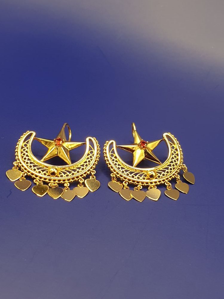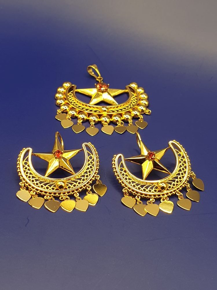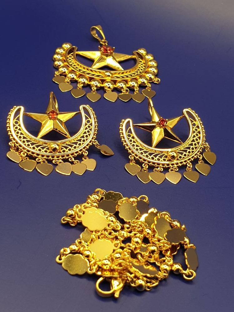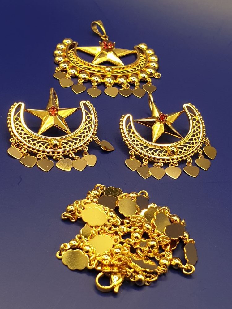 Collier & boucles d’oreilles , élégants dans le ton or, et habillé de joli forme ethnique de qualité, design asserti de petites pierres rouges en zirconium , vous assure une cérémonie tout en beauté.