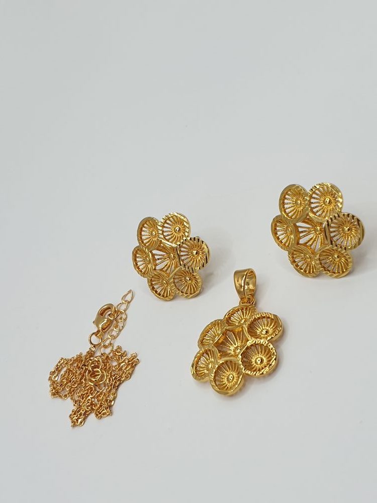 Collier & boucles d’oreilles , élégants dans le ton or, et habillé de joli forme ethnique, design asserti original & rare de qualité , vous assure une cérémonie tout en beauté.