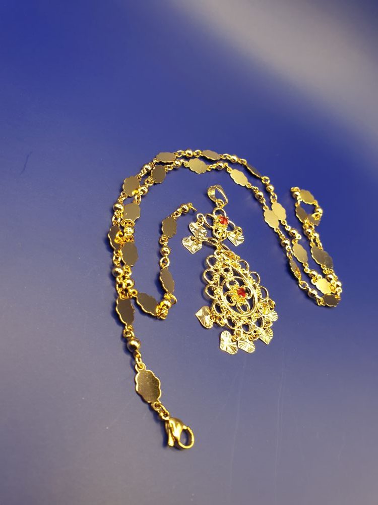 Collier & boucles d’oreilles , élégants dans le ton or, et habillé de joli forme ethnique de qualité, design asserti de petites pierres rouges en zirconium , vous assure une cérémonie tout en beauté